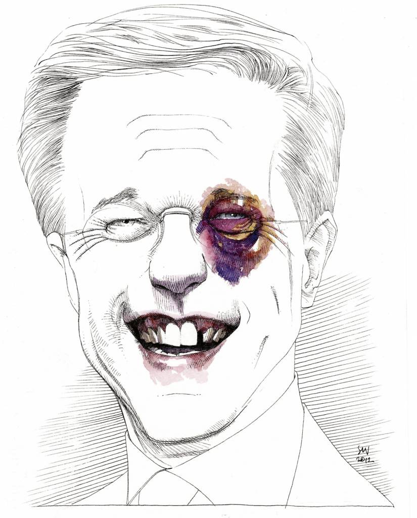 Alle portretten van Woldhek betreffen natuurlijk in de eerste plaats het hoofd, de kop, de tronie, het smoel… Hij kan lang praten over het belang van de neus, hij houdt van oren, met een kin kan hij goed overweg. Bij Woldheks politieke tekeningen gaat het ook over handen. Kijk maar eens hoeveel keer die handen een rol spelen.